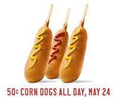 You can head into a Sonic Drive-In today, May 24th for 50cent Corn Dogs all day long. Start your summer break with a treat.